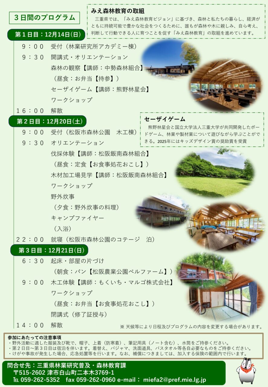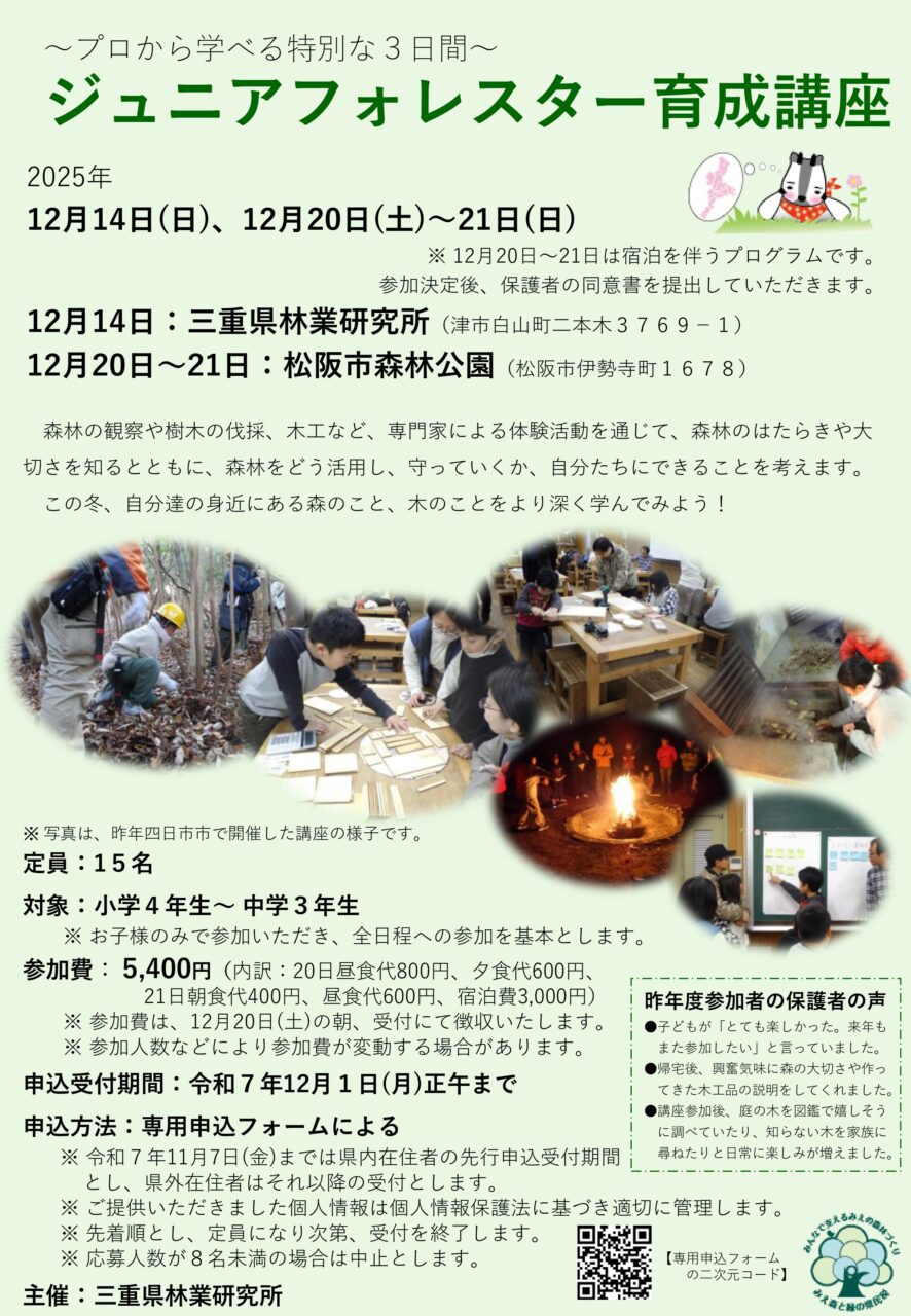2025年12月14日(日)、12月20日(土)~12月21日(日)の3日間、「三重県林業研究所」主催の「ジュニアフォレスター育成講座」が行われます。