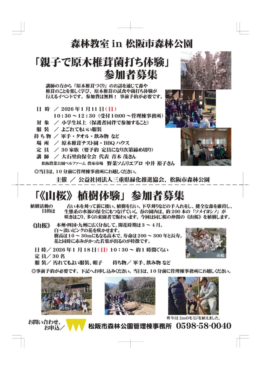 2026年1月11日(日)「原木椎茸菌打ち体験」1月18日(日)「山桜植樹体験」が行われます。詳細は下記チラシをご覧ください。