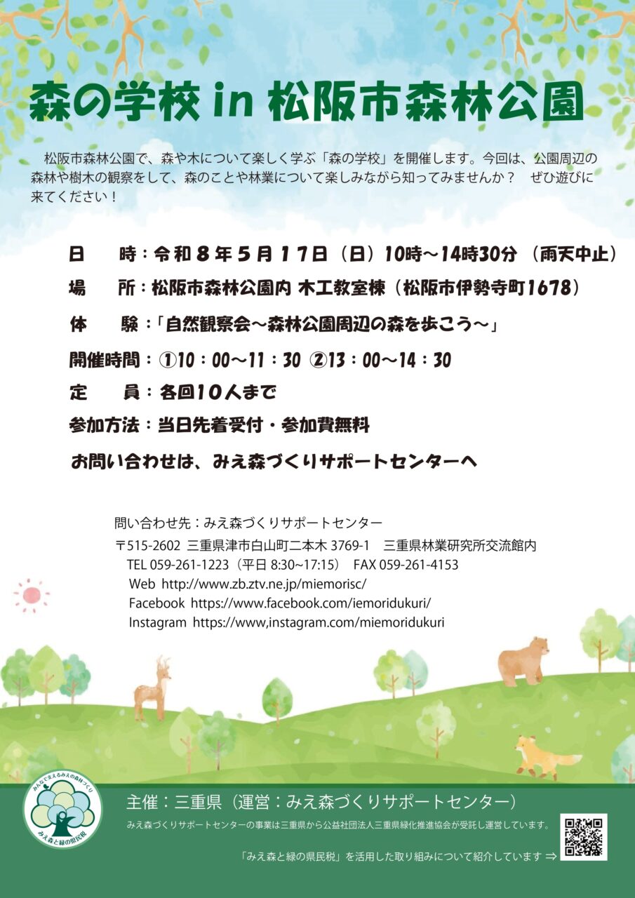 5月17日(日)松阪市森林公園にて「森の学校」が開催されます!今回は自然観察会を致します。当日先着順で参加費は無料です!詳細は下記チラシをご覧ください。